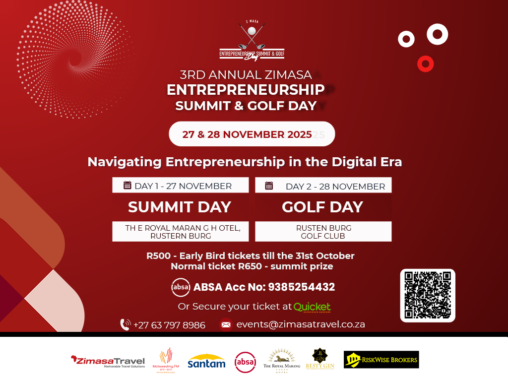 Date: November 27, 2025 Location: Rusternburg Address: Royal Marang Hotel, Rusternburg and The Rusternburg Golf Club Rusternburg Don’t miss the upcoming 3rd Annual Zimasa Entrepreneurship Summit & Golf Day. The Summit will be held at the Royal Marang Hotel, and the Golf event at the Rusternburg Golf Club from the 27-28th November 2025.